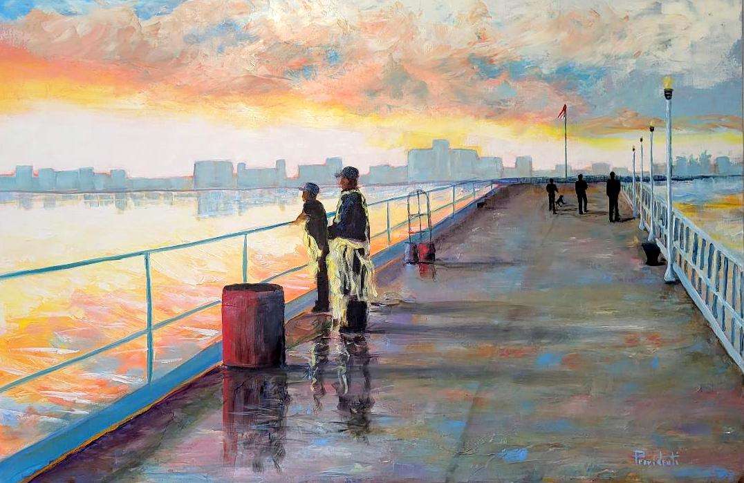 Un dipinto di figure su un ponte che sovrasta un mare e un tramonto, con uno skyline urbano sullo sfondo.